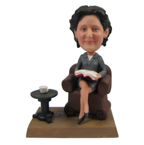 So, I was thinking it would be wonderful for you to choose a figurine that surprises her in one of those peaceful moments she adores so much. Maybe a figurine in a relaxed posture, comfortably seated on a couch with a good book in hand. Imagine her calm and focused expression, enveloped in the quietness of books and her thoughts.